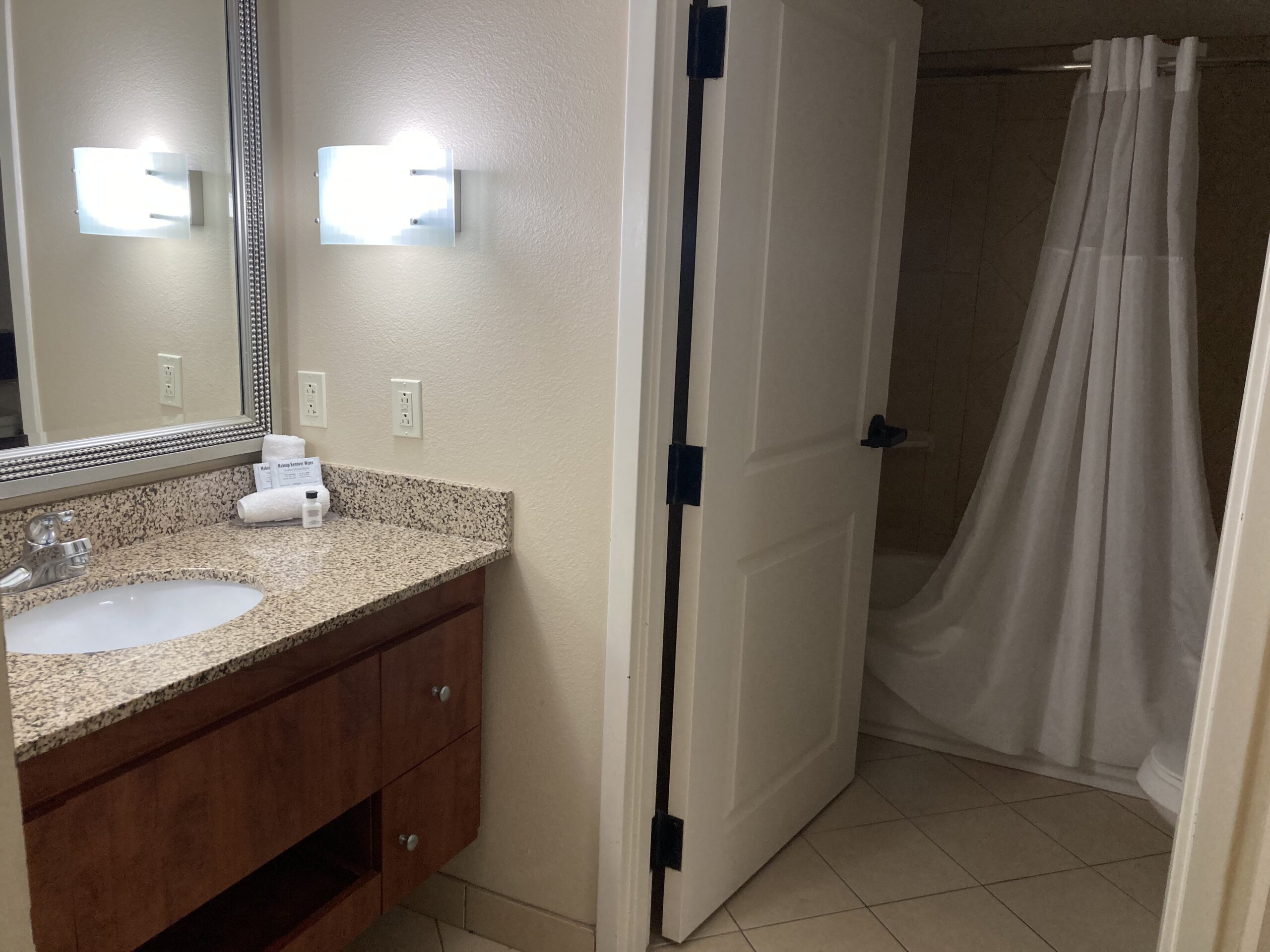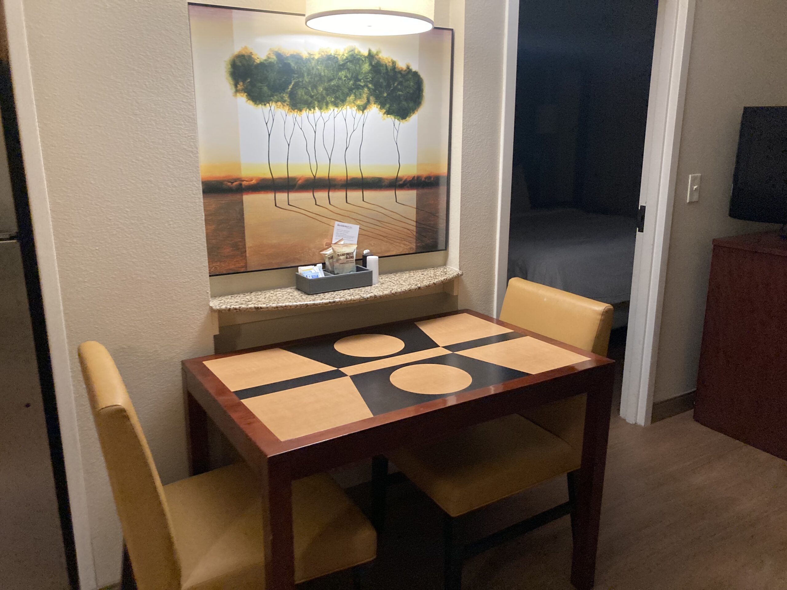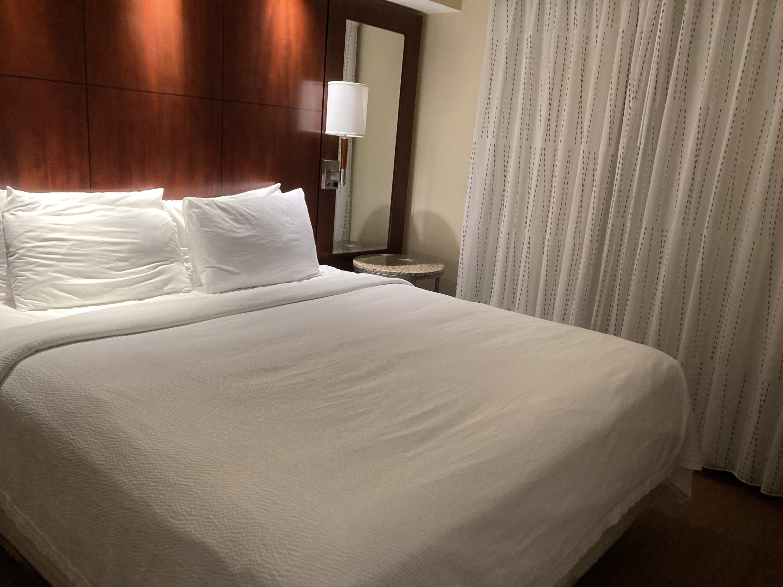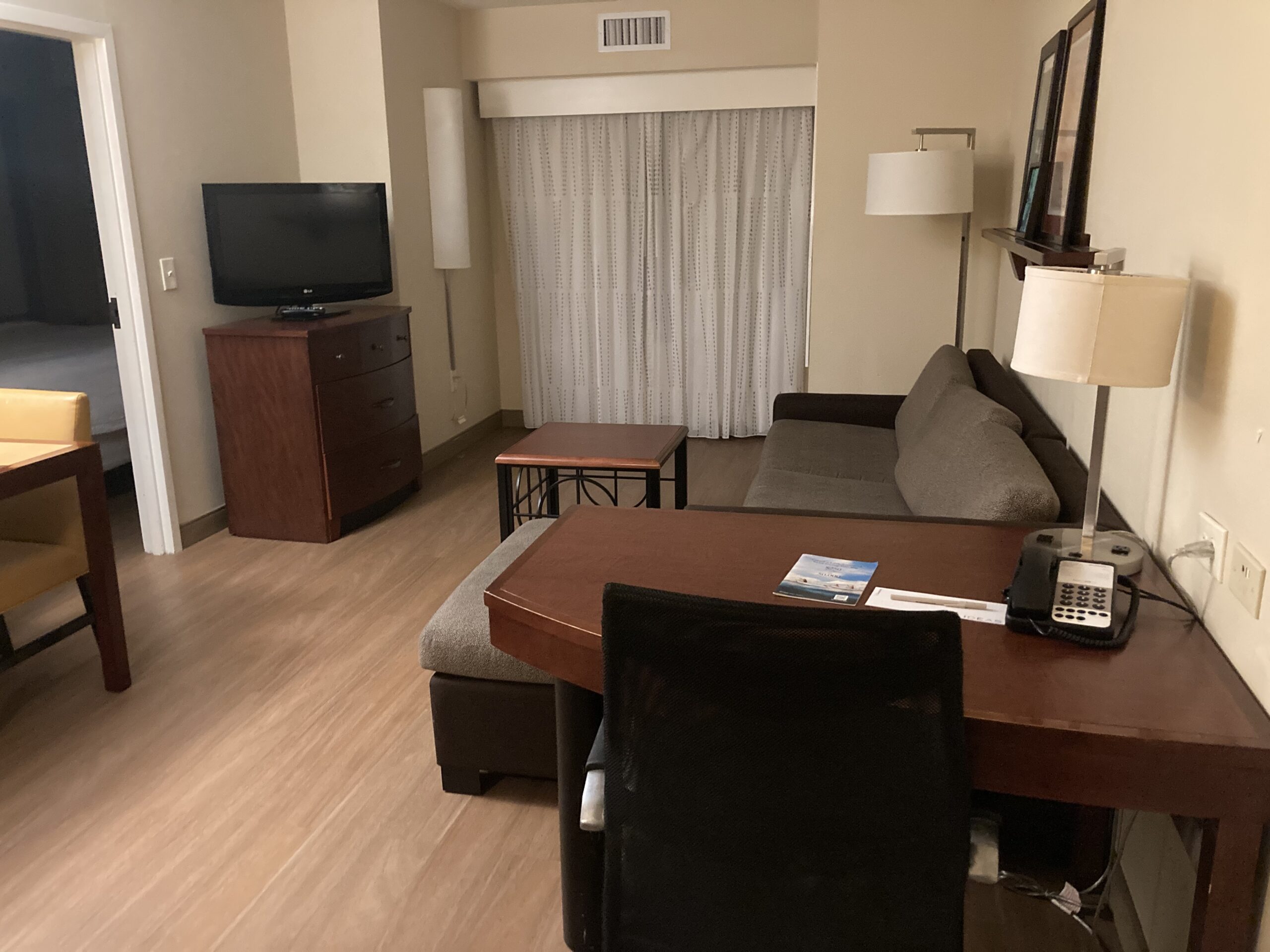 マリオット系列のとこだったけど部屋が立派で!もったいない。キッチンあるし、大きな冷蔵庫、食器類、水場もパーフェクト。ソファーもデスクも、テレビはリビングと寝室両方にある、至れりつくせり!