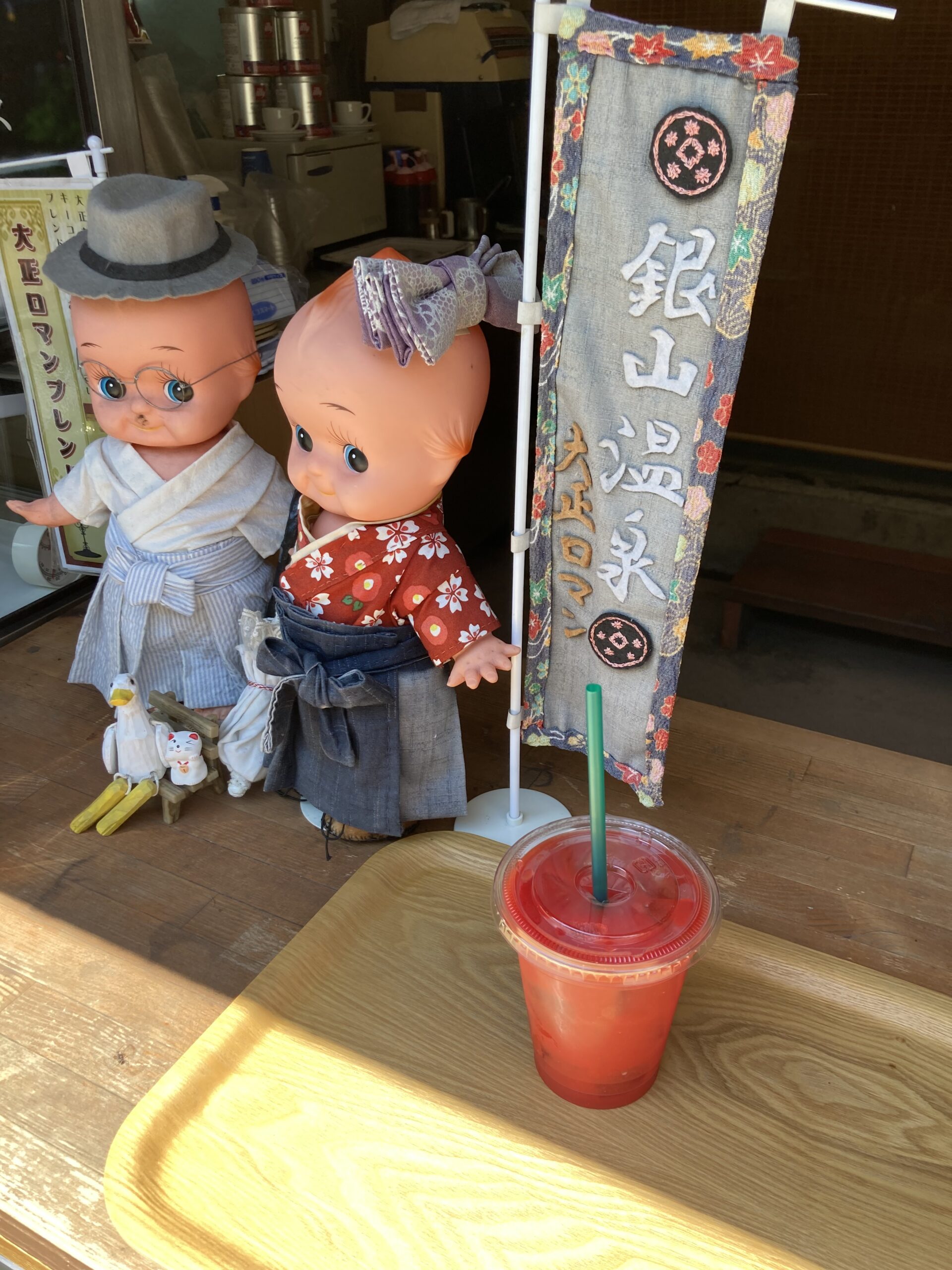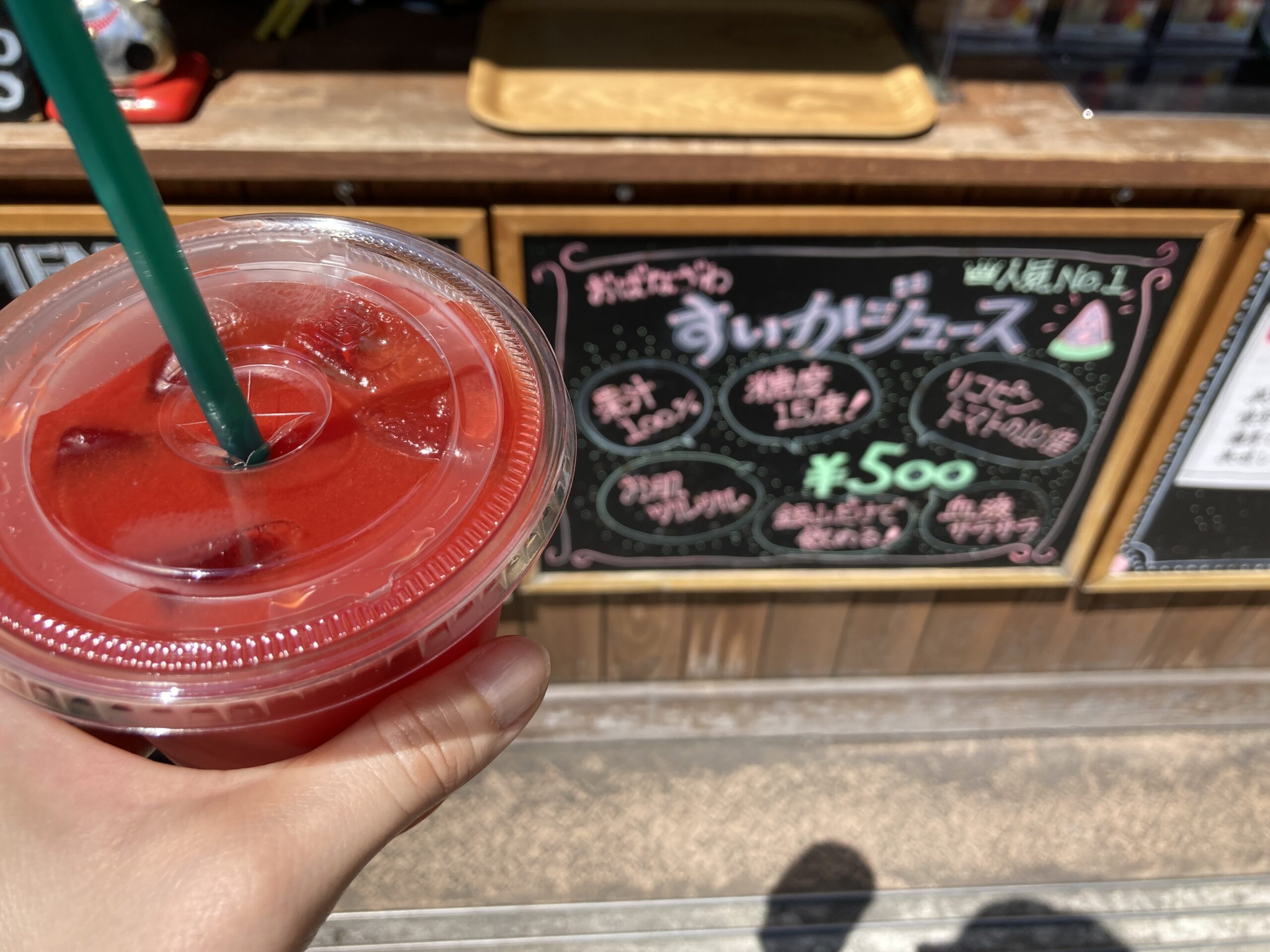 隣の売店でスイカジュースを購入。尾花沢のスイカは7月末からの販売とのことで、まだ街ではスイカの販売は見られませんでした。