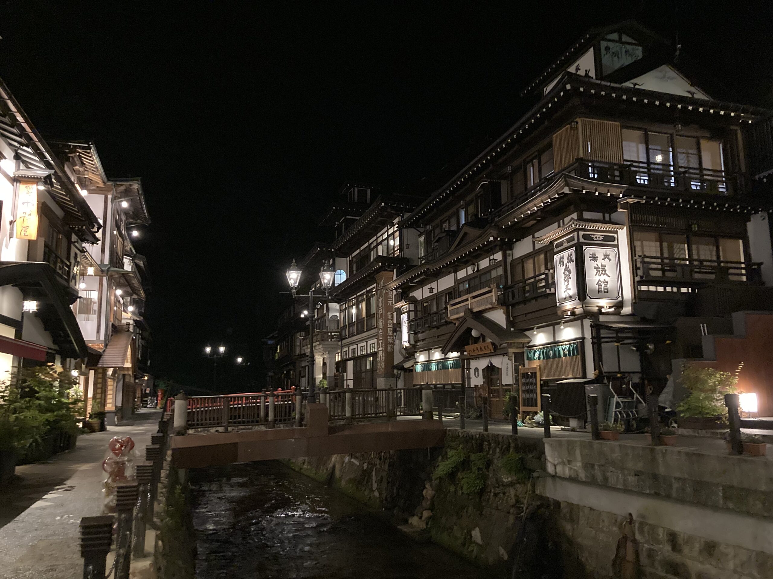 夕食後もお風呂を楽しみ、街も散策。銀山温泉街は夜の町並みが人気です。
