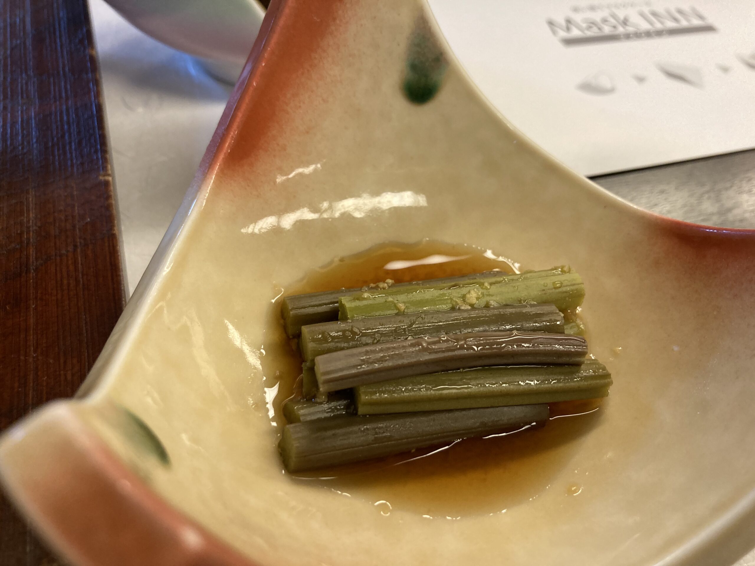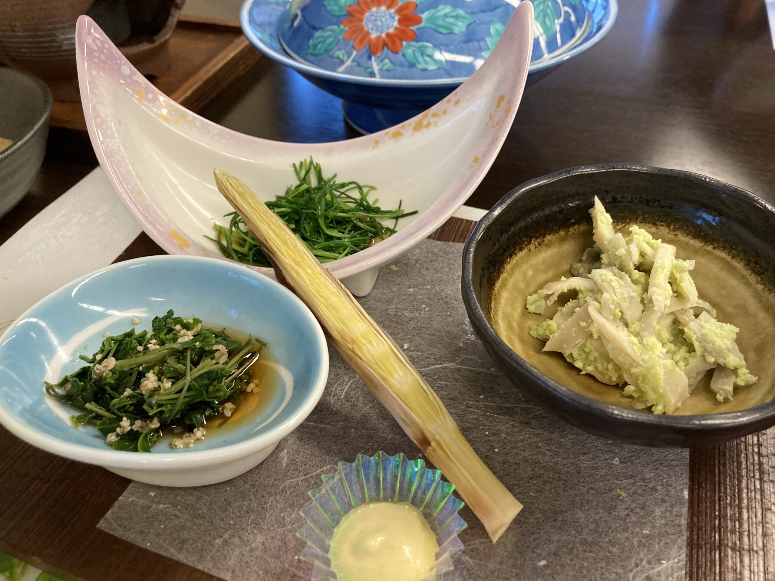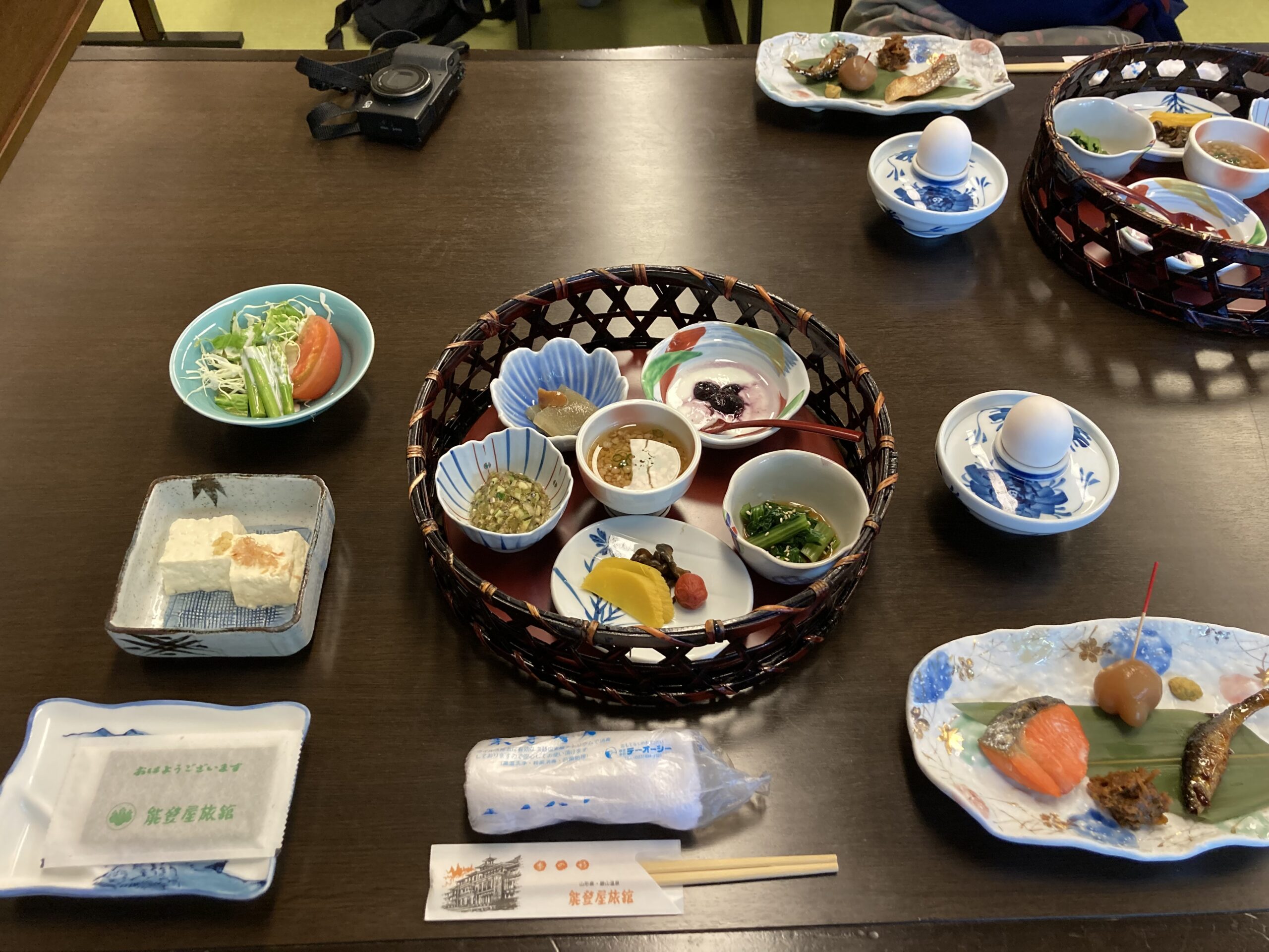 こちらのご飯も非常においしいです。前日の宿の食事は創作料理も多いと感じましたが、能登屋はより元祖和食という感じがします。鯉の刺身も鯉の煮つけをぺろりと食べてしまいました。鯉はたまに一口食べて鯉の独特の香りにもうこれ以上食べられない!っていうこともあります。こちらは美味しく頂きました。そして、山菜を活かした料理が本当においしくて!感動しました。
