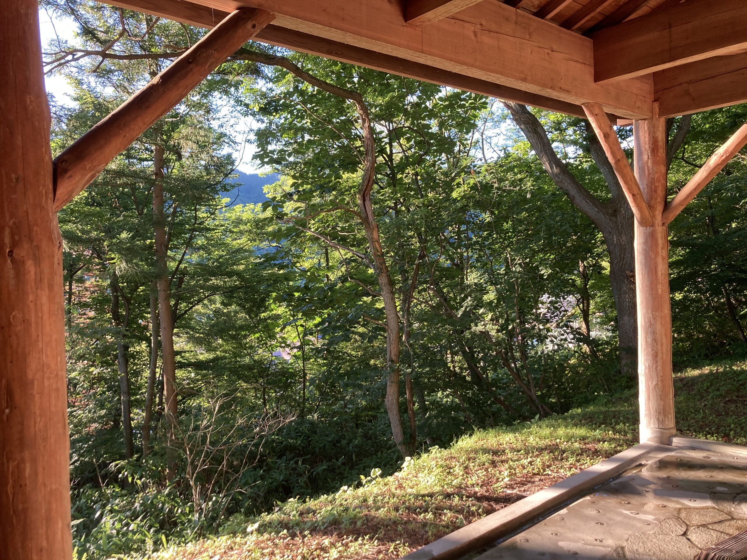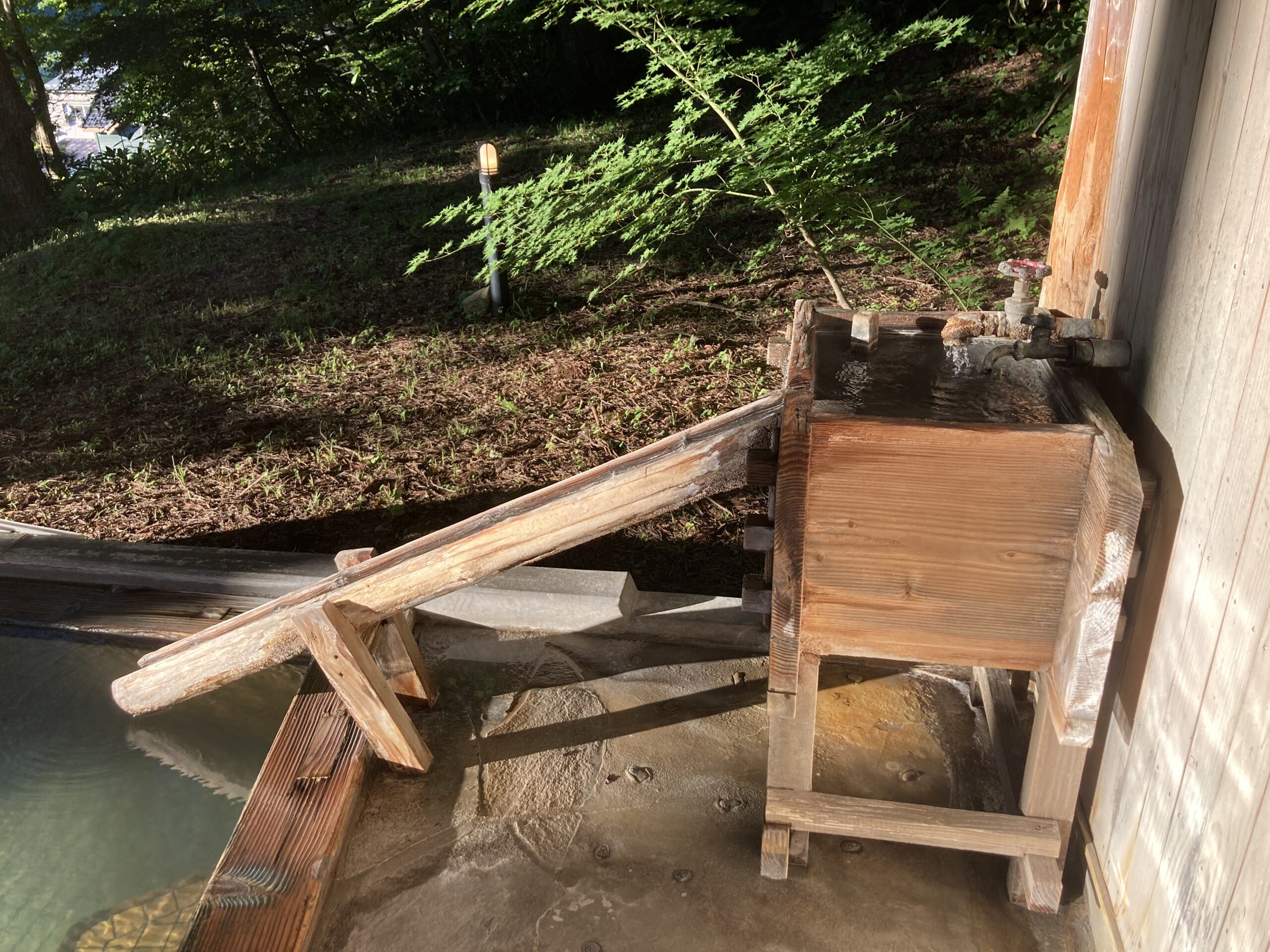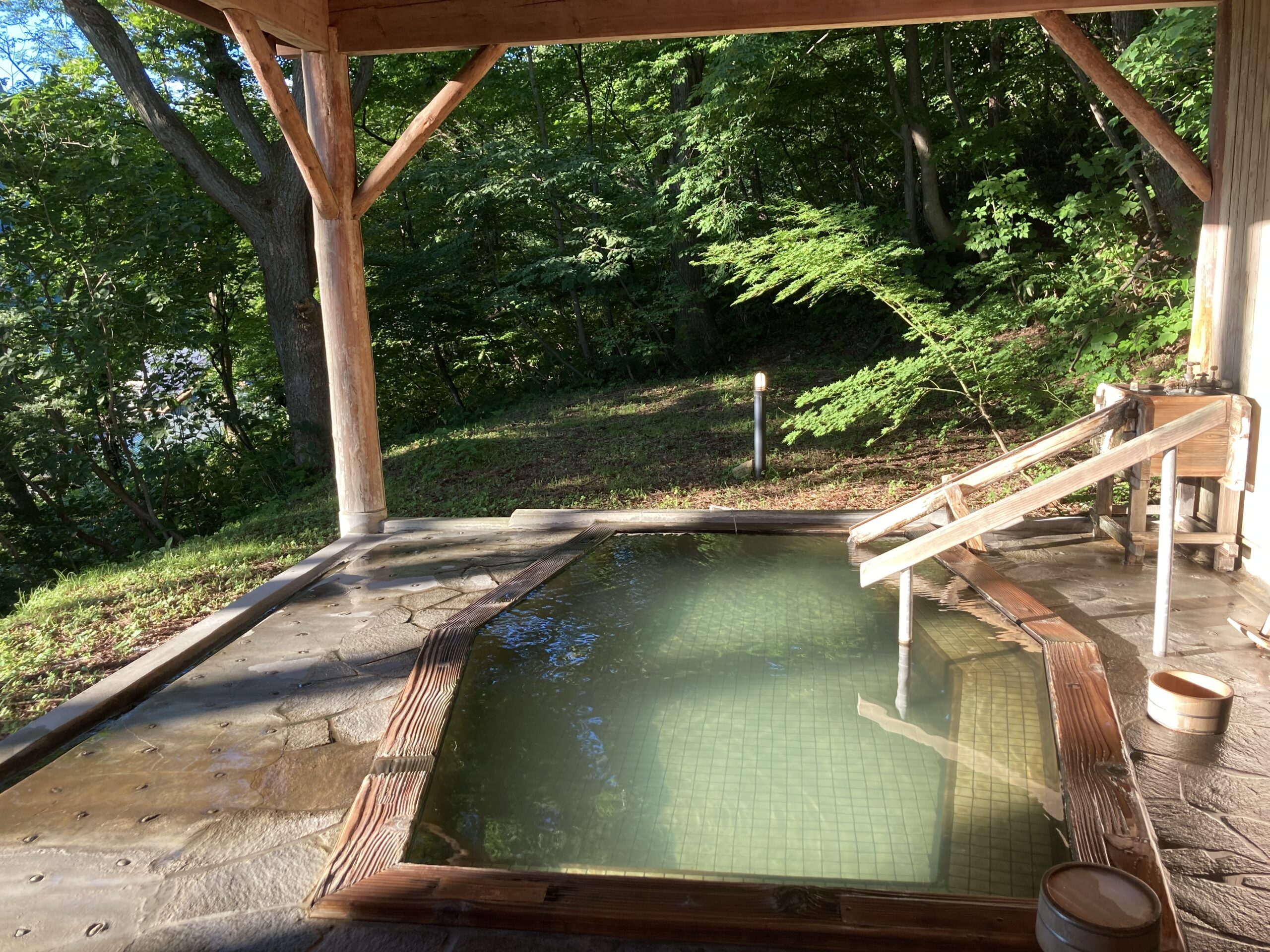 旅館の建物から坂道も含めて歩いて2,3分くらいのところにある「茜の湯」。かなり広めの湯舟。解放感しかなくて、夜はさすがに危ないかもしれない。湯は硫黄含むアルカリ性。さっぱり、少し熱めで良い風呂でした。のぼせるのでお水を持っていくのが良いと思う。この辺りは風邪も涼しくて暑いという感じではなかった。