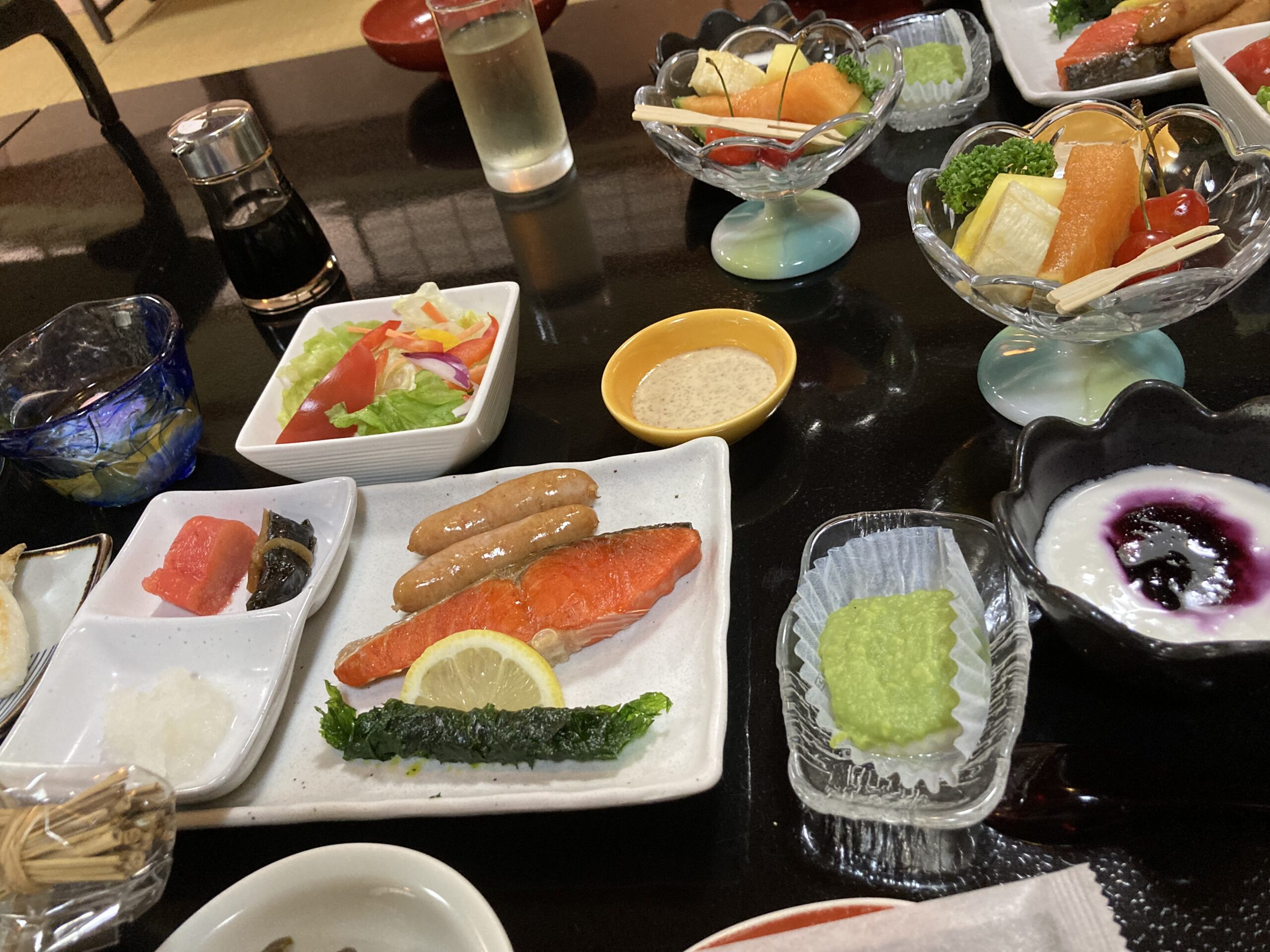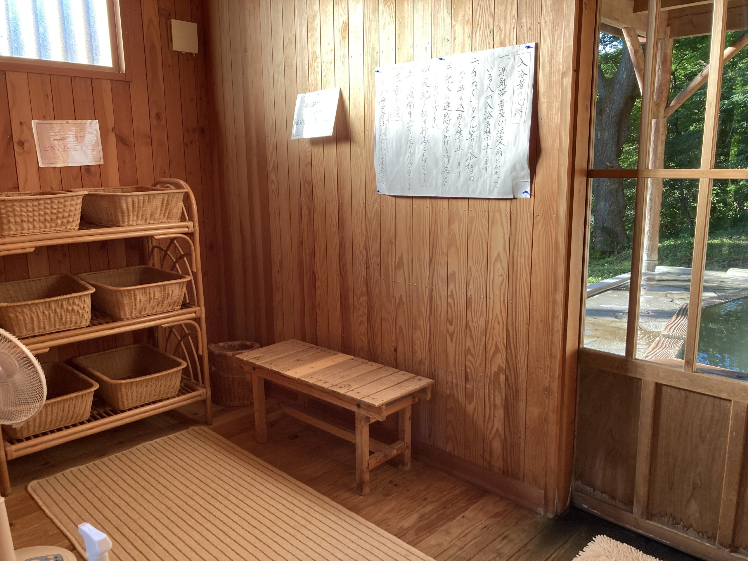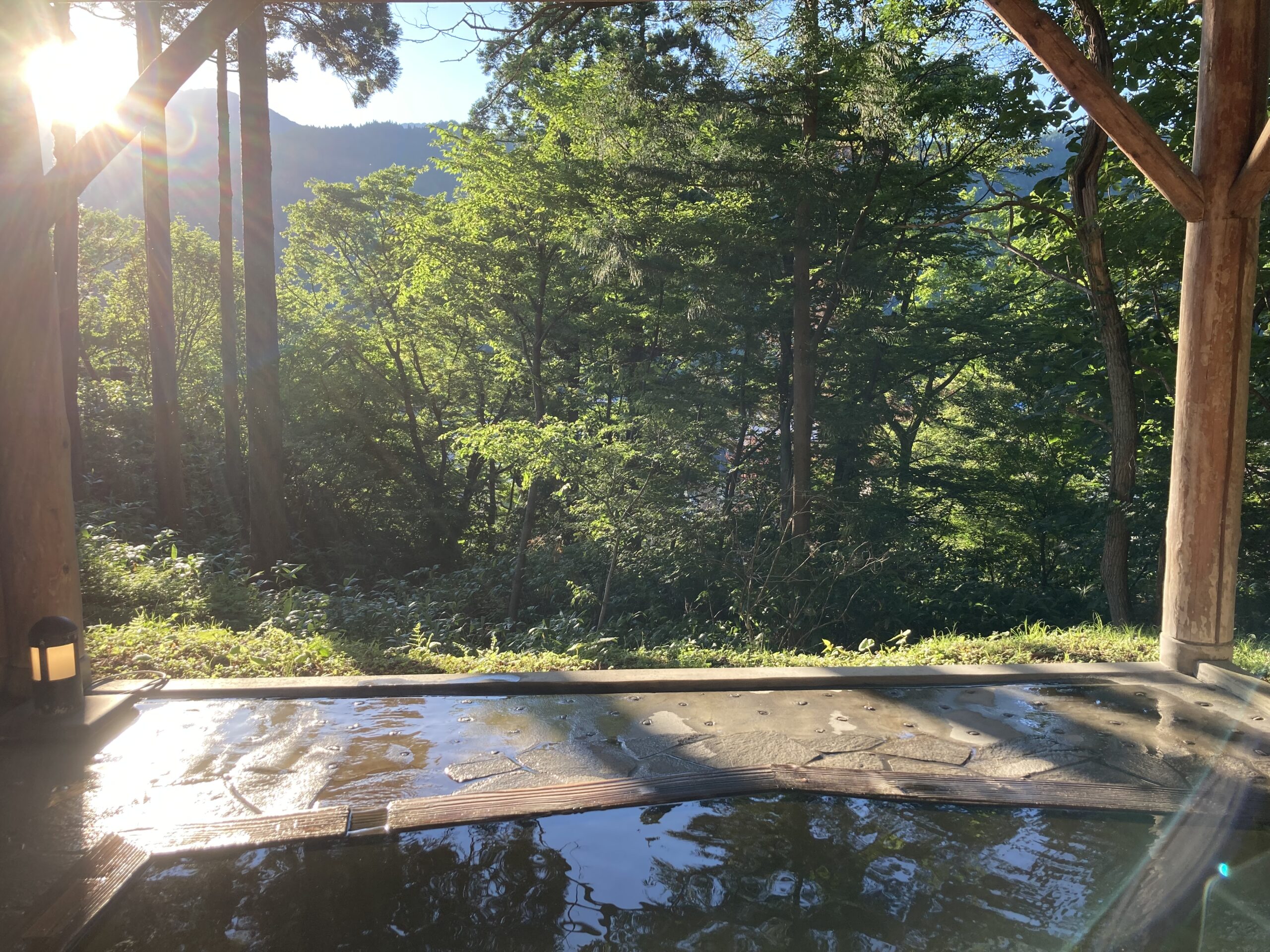 旅館の建物から坂道も含めて歩いて2,3分くらいのところにある「茜の湯」。かなり広めの湯舟。解放感しかなくて、夜はさすがに危ないかもしれない。湯は硫黄含むアルカリ性。さっぱり、少し熱めで良い風呂でした。のぼせるのでお水を持っていくのが良いと思う。この辺りは風邪も涼しくて暑いという感じではなかった。