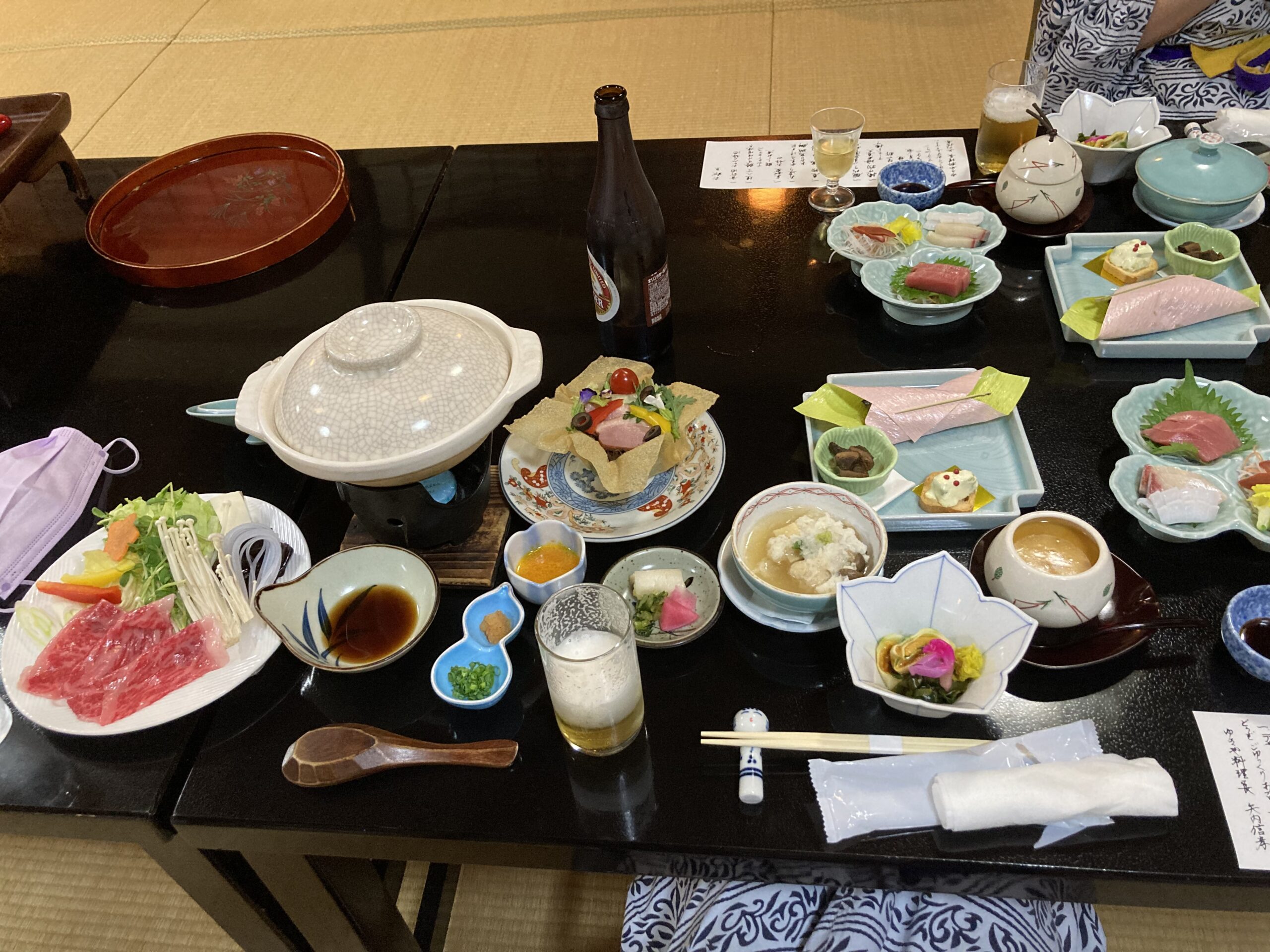 待ちに待った夕食です。部屋からすぐ近くの広間で、区切られていたので貸切のようなかたちでゆっくり頂く。全体的な食事のクオリティはかなり高いと思われます。創作料理も交えており新しい味にもトライしている感じでした。お肉はもちろん、お刺身の鮮度が良くて驚きだった。