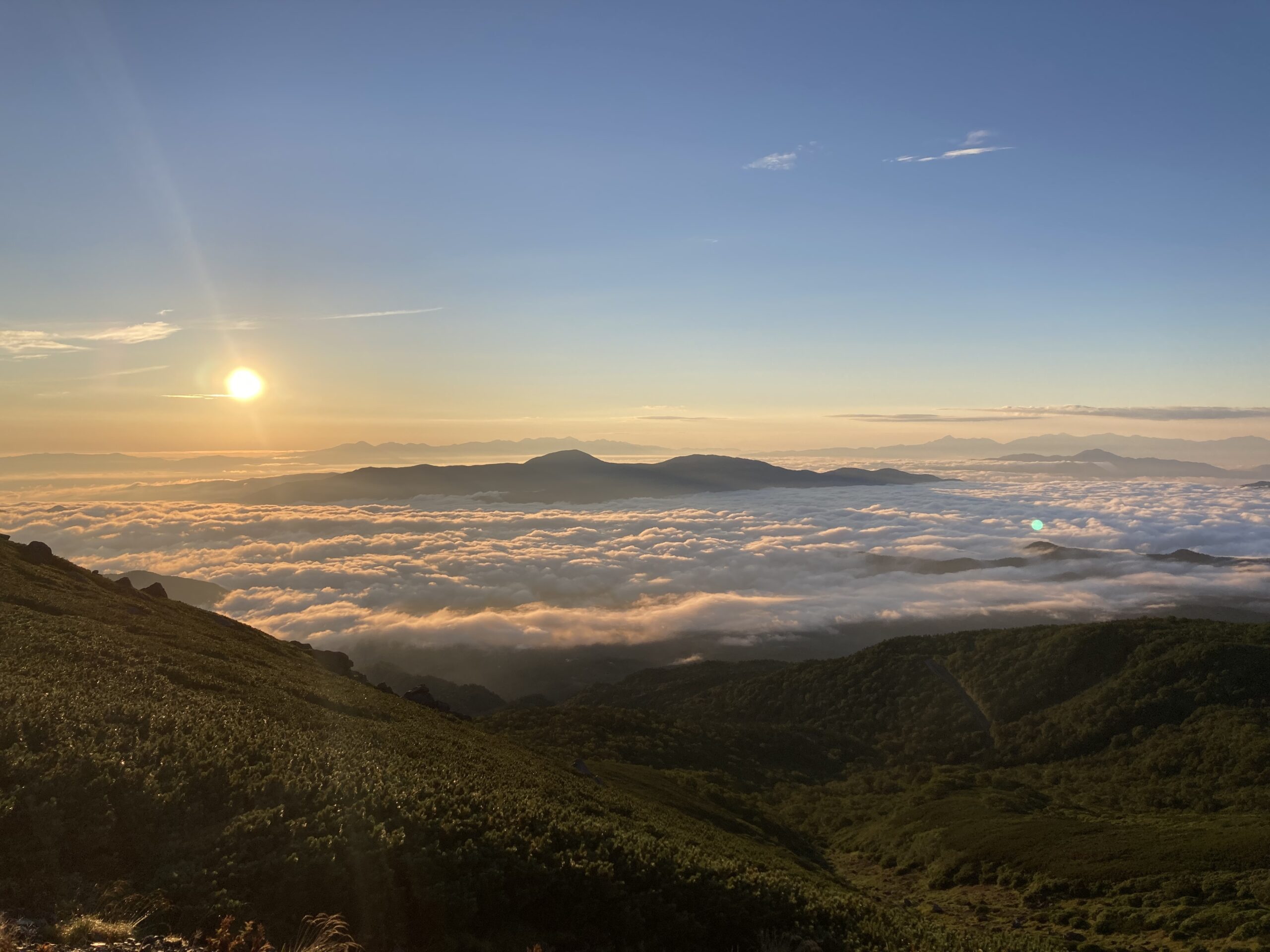 雲海と山と空と太陽と、向こうにはまだ月もいる。