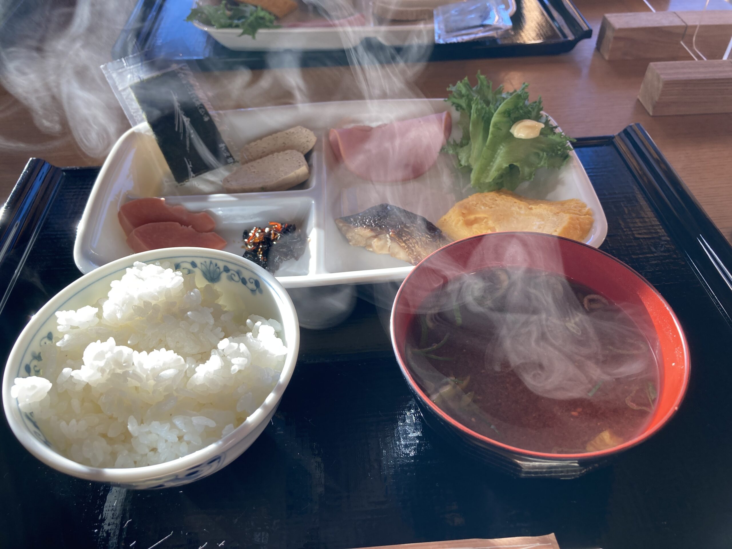 窓から見える朝日がもう主張がすごくて眩しがりながらおいしく朝ごはんをいただく。