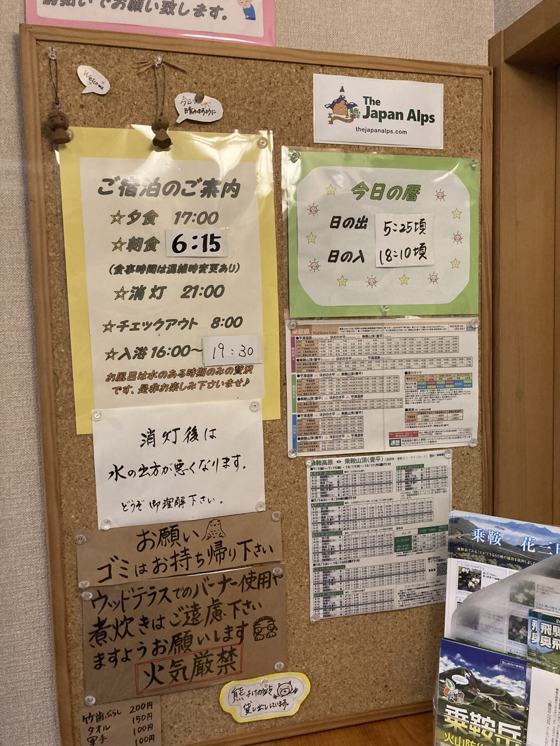 お風呂は夕食は17時から、日の入りが18時前後、入浴は19:30まで、消灯が21時だもんでこれは案外いそがしや。