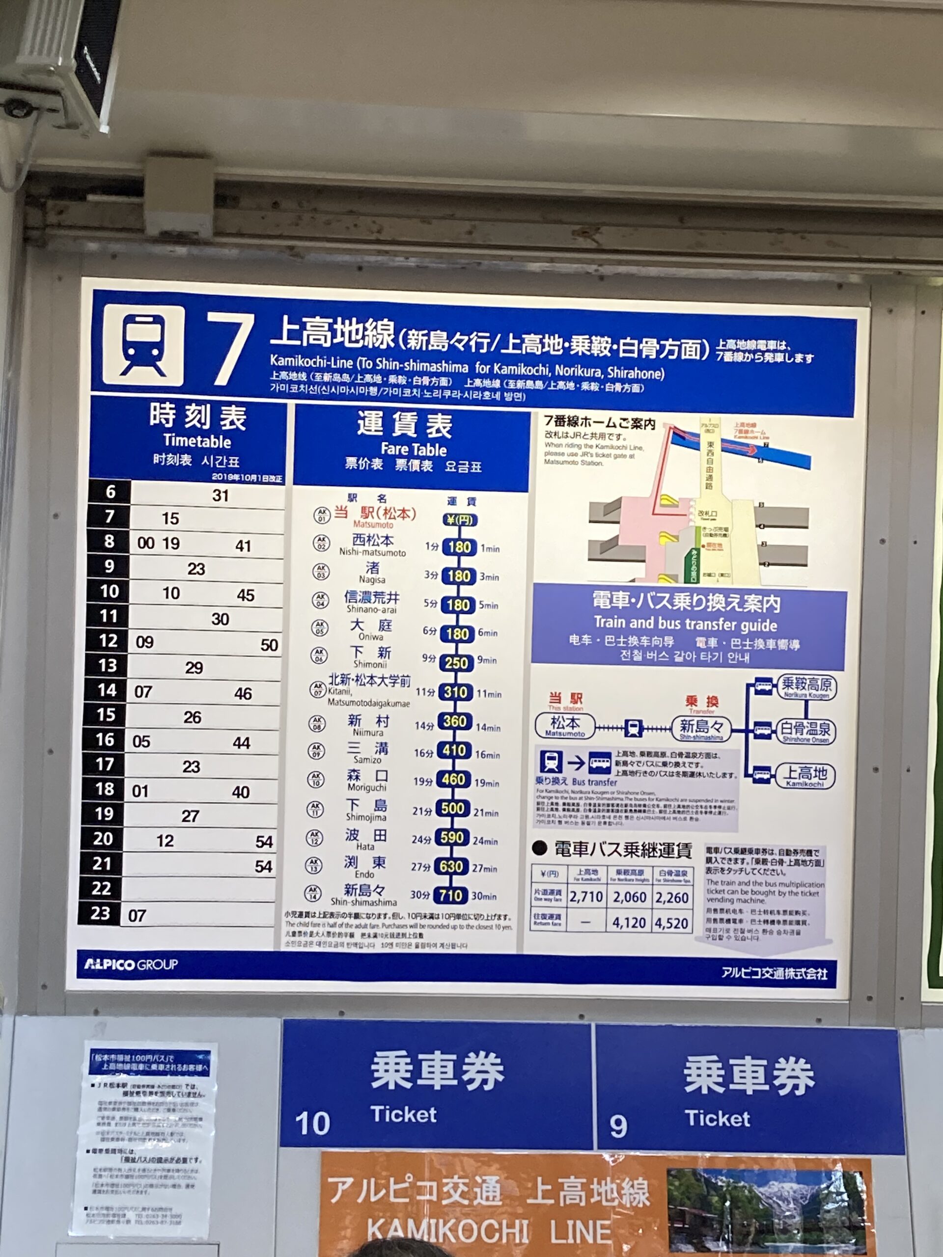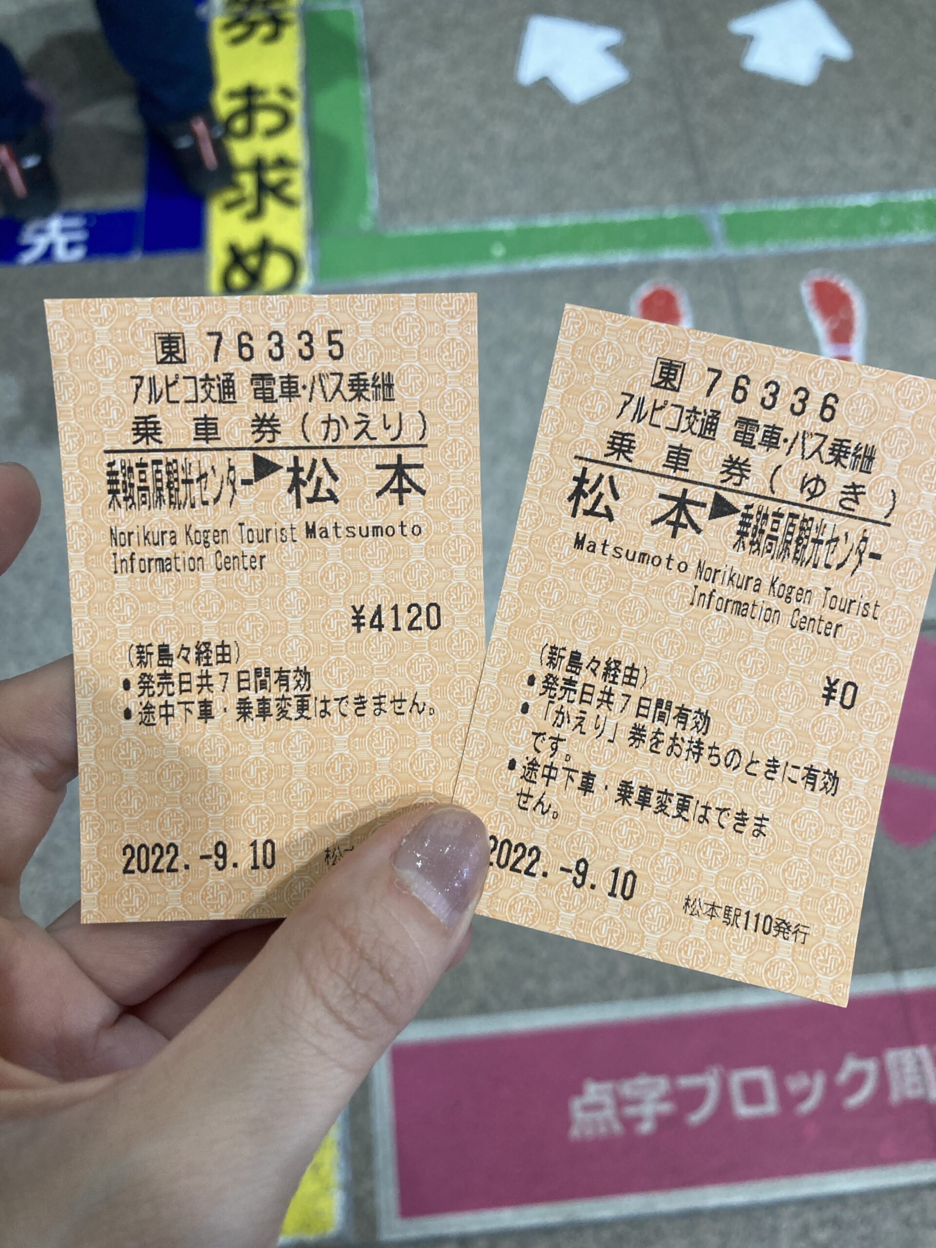 松本駅で切符を購入。松本駅から新島々駅までの電車&新島々から乗鞍観光センターへのバスのセットの切符の往復券を購入(4120円)