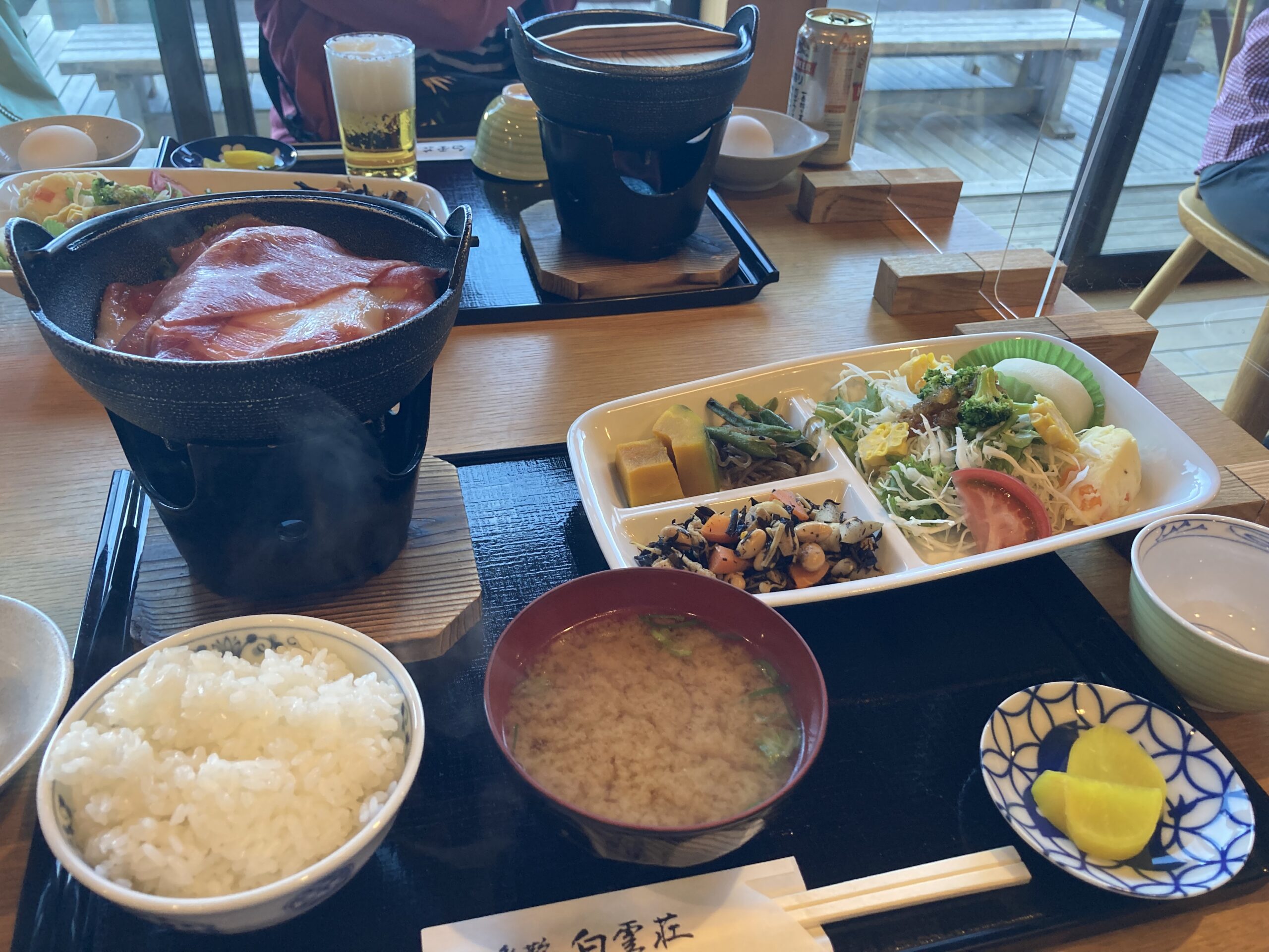 なんと、飛騨牛のすき焼き。野菜もたっぷり。お酒も飲める。私は控えめにノンアルで。皆ロング缶飲んでるよ笑