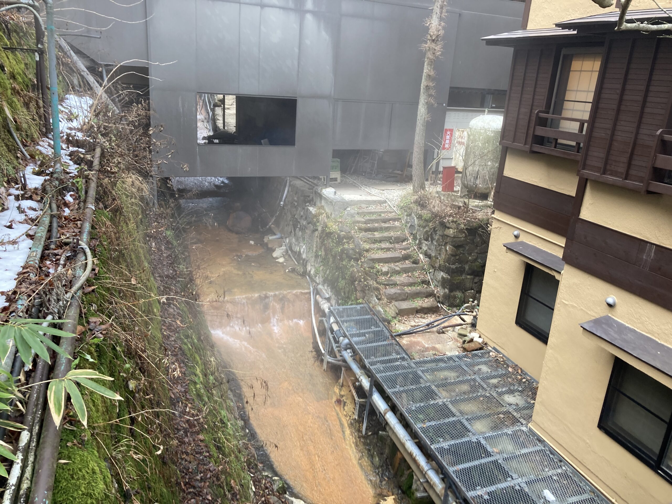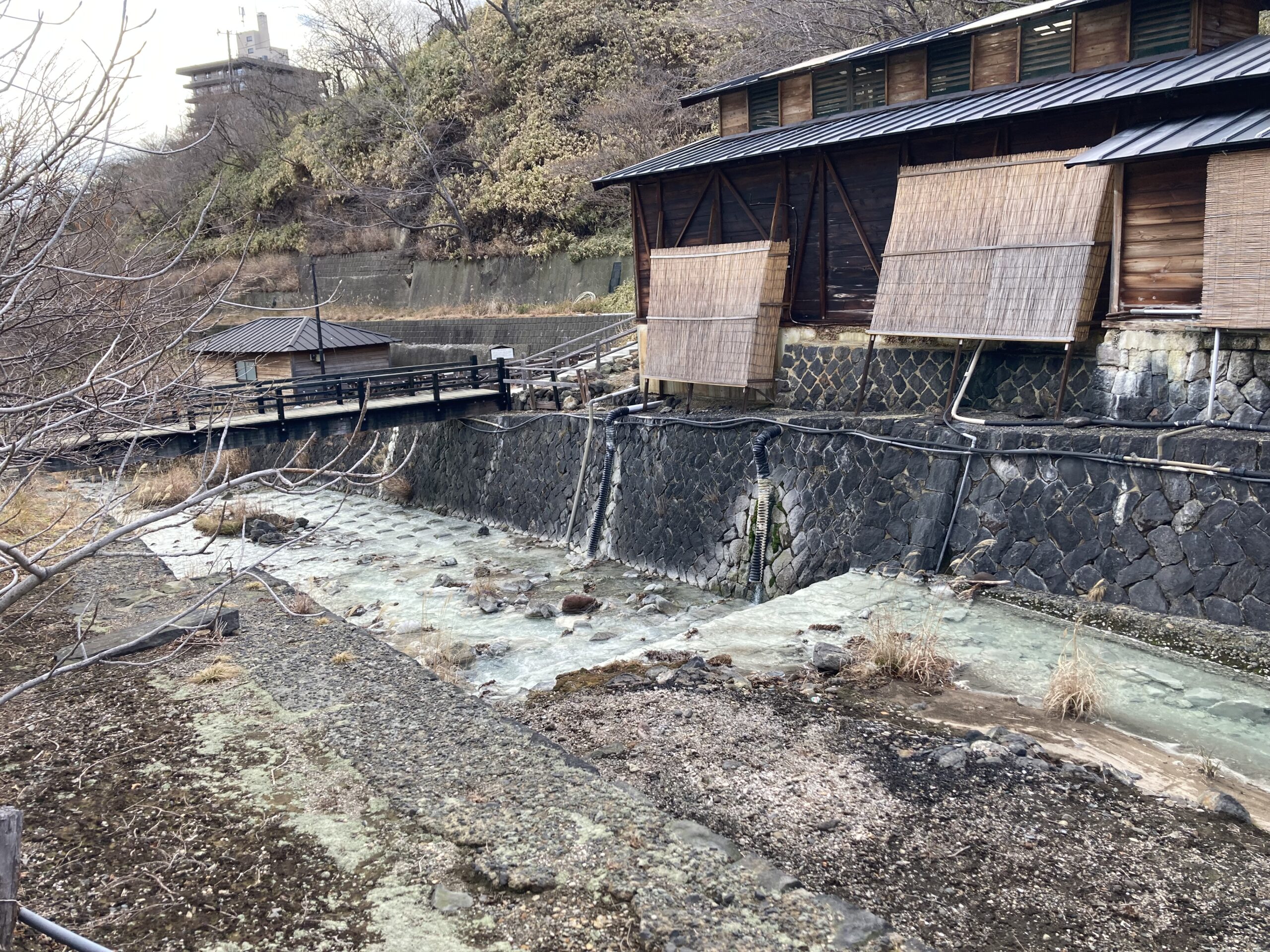 宿の到着と同時に勢いのある川のような温泉が流れているのが目に飛び込んできます。川の湯とも称しています。