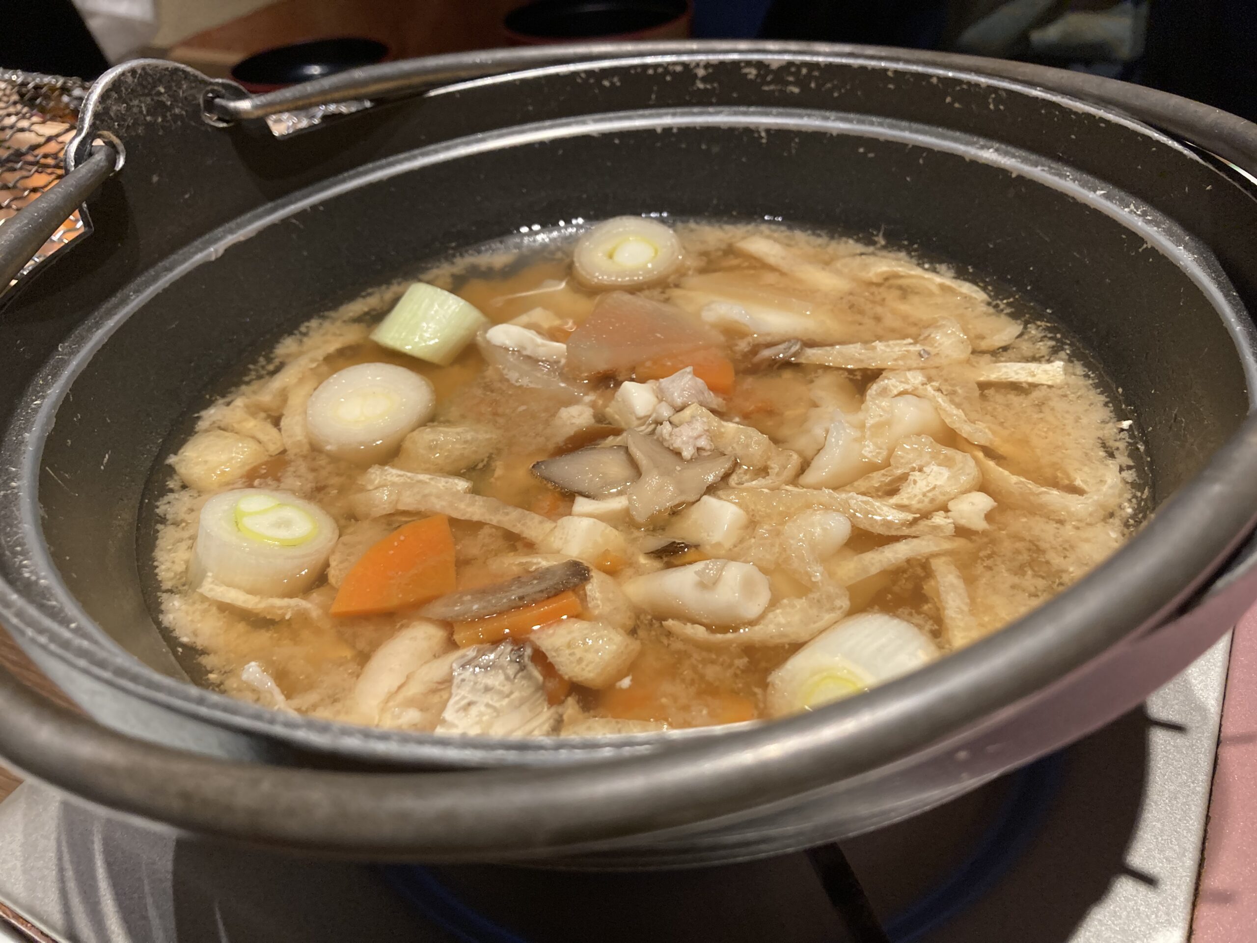 具だくさんたっぷり味噌汁鍋。ごはんかおかゆか選択できます。ぎりぎりまでゆっくりしてから、宿を出ます。少し近場の観光。